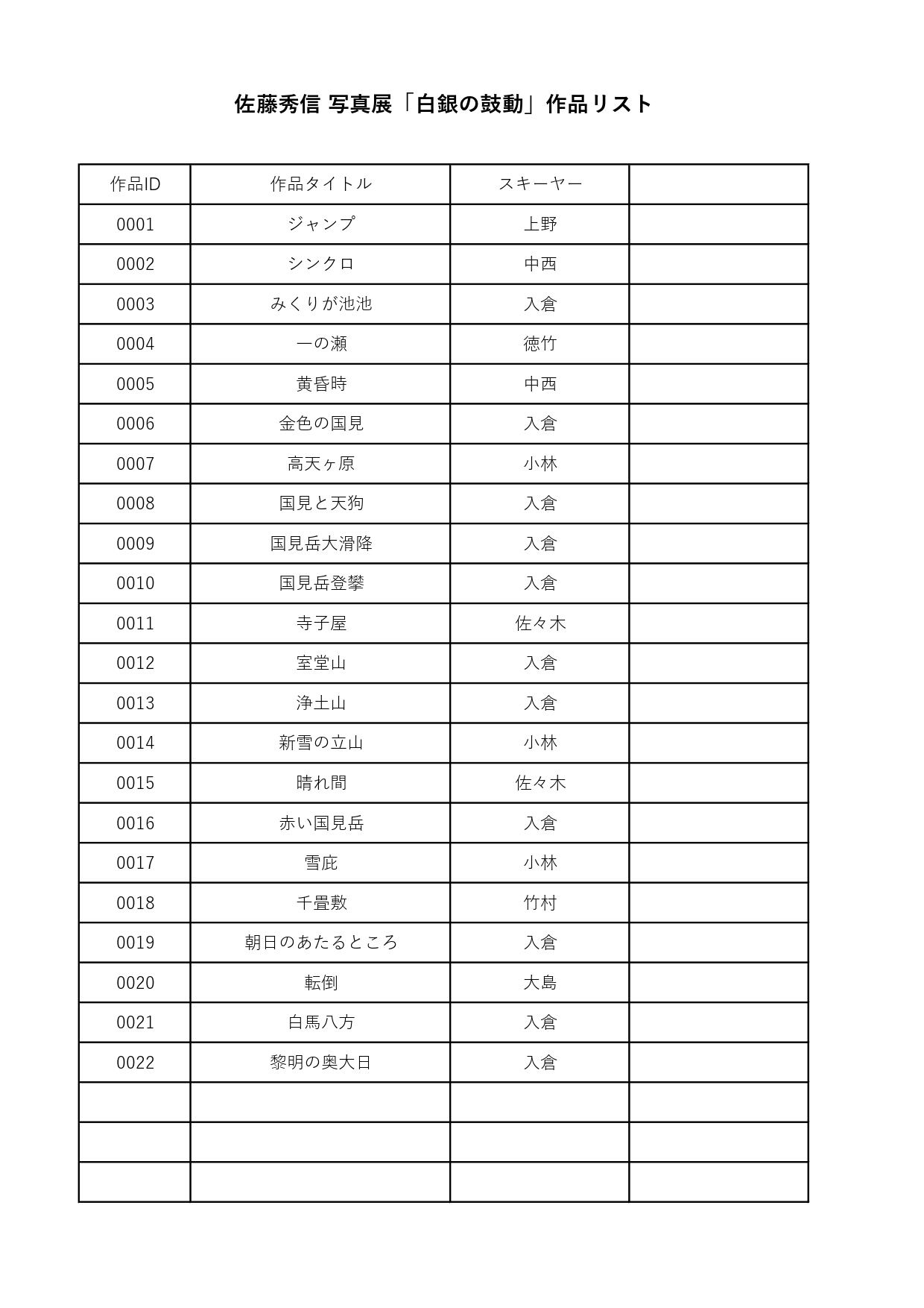 スキーは楽しい! しかしそれを伝えることを職業としたとき、想像を超える難しさ厳しさがあります。あえてその仕事を選び、氷点下の中で自分たちを磨く人々による滑りの美しさ、格好の良さを表現しようとしました。私はプレーヤーの美しさや格好の良さは、鍛えられた肉体と技術からしか生まれないと考えています。私の拙い技術で、それをどれだけ捉えられたか心もとないところですが、もし「いい写真」と思って頂けたならば、 それは彼らの研鑽や努力を写し込めたのだと考えます。山で精一杯に躍動するプレーヤー達の鼓動を感じていただけたら幸いです。